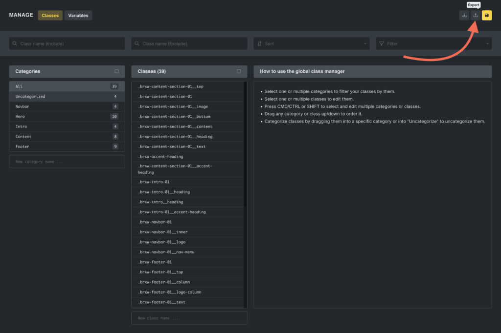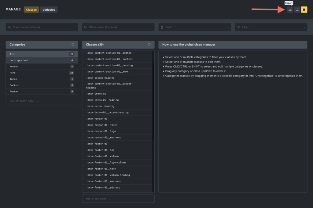 Section titled “Exporting and importing classes”The Global Class Manager facilitates the exporting and importing of CSS classes, making it easier to maintain a consistent styling framework across various Bricks projects.