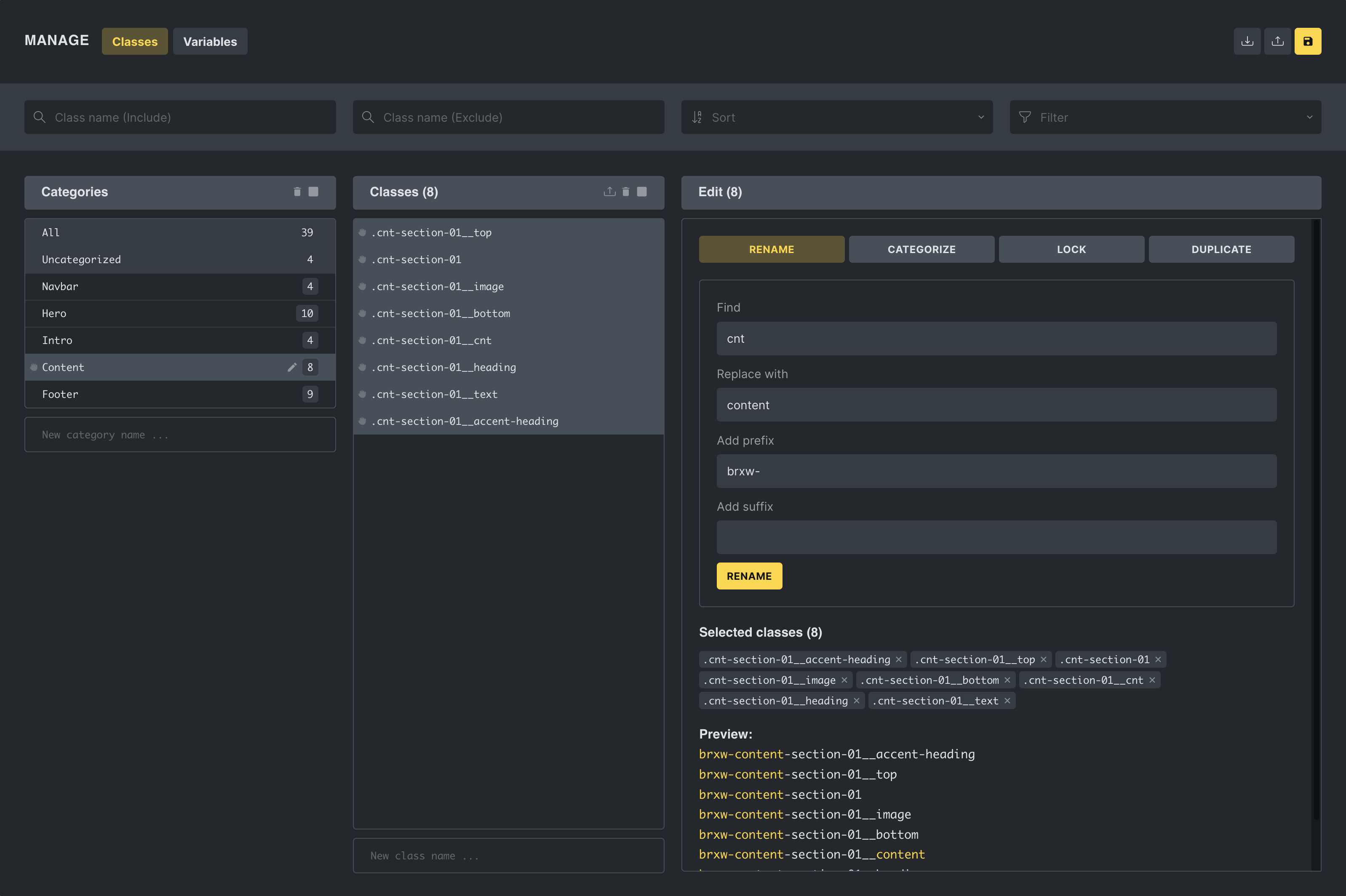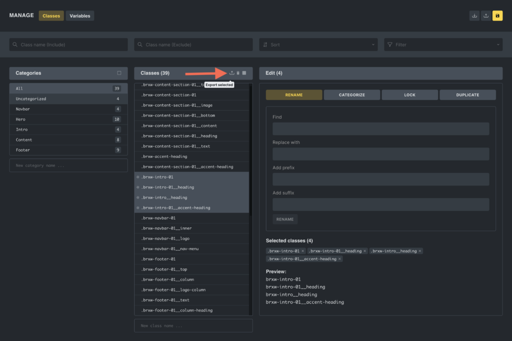 - Bulk actions: When two or more classes are selected, the editor enables users to perform mass actions such as renaming, duplicating, locking, and unlocking classes. These actions include the ability to find and replace strings or add prefixes or suffixes to class names.
