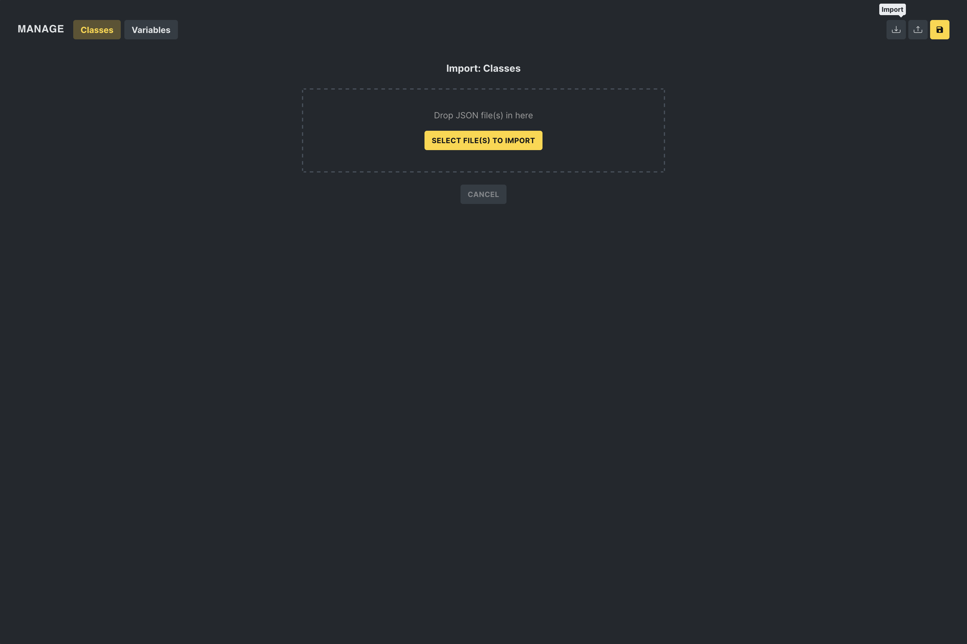Section titled “Importing classes”In the “Import” popup, users can drag and drop a JSON file containing exported classes, streamlining transferring classes between projects.