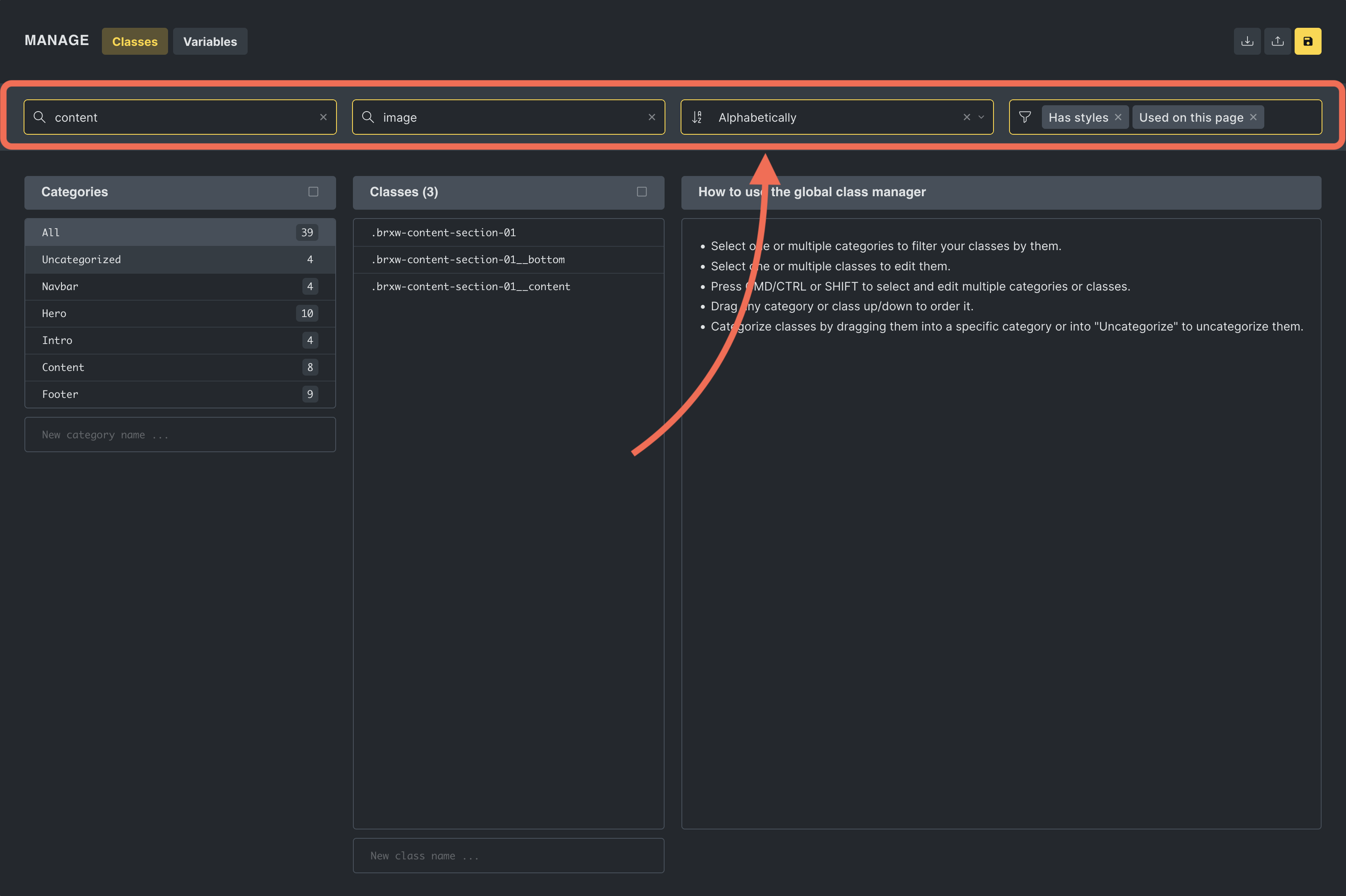 Section titled “Search and sorting capabilities”In the header of the Global Class Manager, you can filter classes by:
