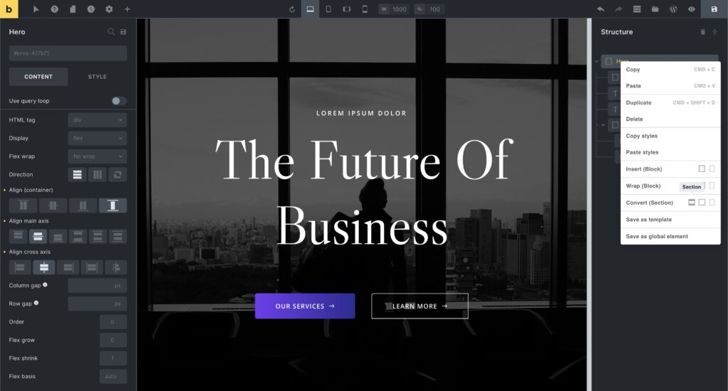 The screenshot below shows how to convert a root Container to a Section by right-clicking on the “Hero” Container in the structure panel, and then selecting the “Section” icon under “Convert”:
