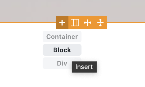 When editing a layout element, you can insert any other layout element by hovering over the ”+” icon on the canvas, which provides you with “Container”, “Block”, “Div” options.