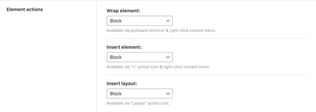 Section titled “Element actions: Setting the default element”Under “Bricks → Settings → Builder → Element actions” you can change the layout element that’s being used by default for “Insert”, “Wrap”, and the “Layout” tool: