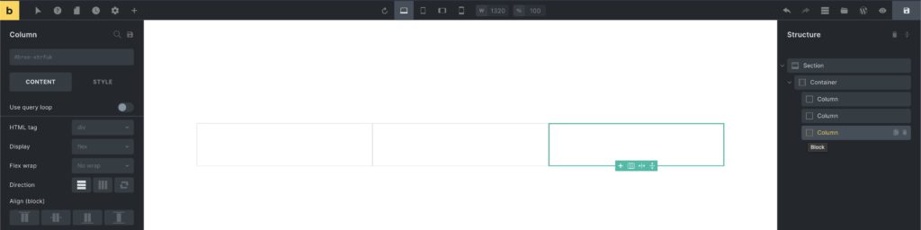 The fastest way to create a multi-column layout is to select the Container, click the little “column” layout icon on the canvas, and select the pre-defined column layout of your choice: