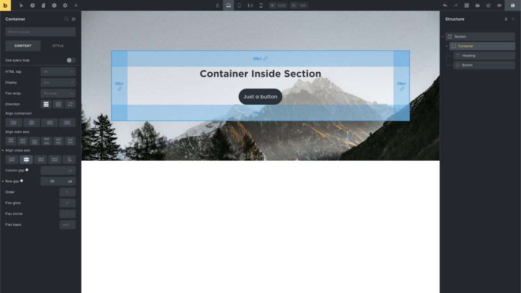 The following screenshot shows a Container (with 60px padding) inside a Section (with background-image):