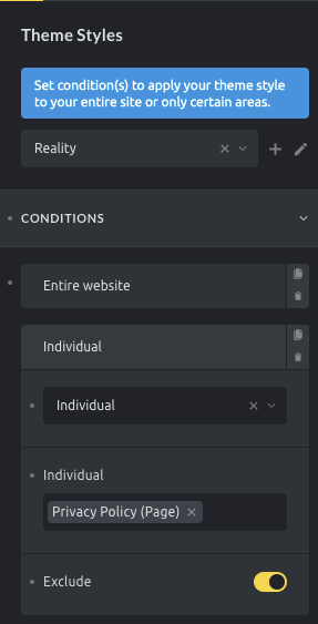 Section titled “Exclude condition”Since Bricks 1.3.6 you’ll be able to set exclude conditions for any theme style. To exclude a specific condition you need to toggle the exclude control. Excluding a certain condition will let Bricks know that if the condition applies in a certain scenario, then that theme style won’t be used.