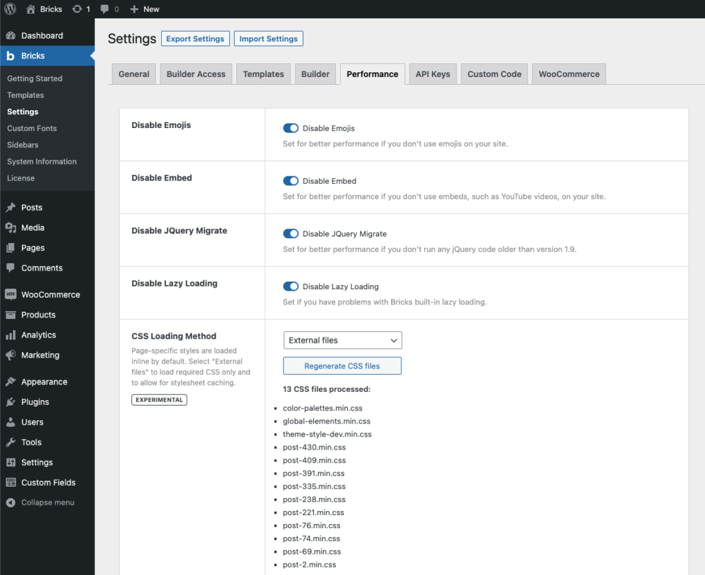 To regenerate all CSS files in one go, please click the “Regenerate CSS files” button located under the “CSS loading method setting. This action is only available after the CSS loading method has been set to “External Files”.
