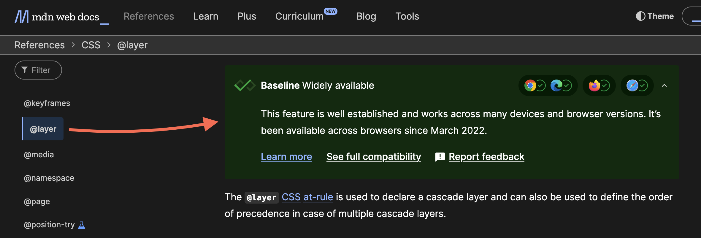 Section titled “Which CSS features does Bricks use?”Bricks only uses CSS features that have reached the Widely Available stage under Baseline. For example, the :where pseudo-class and @layer CSS at-rule are already in that stage and are part of Bricks’ output.