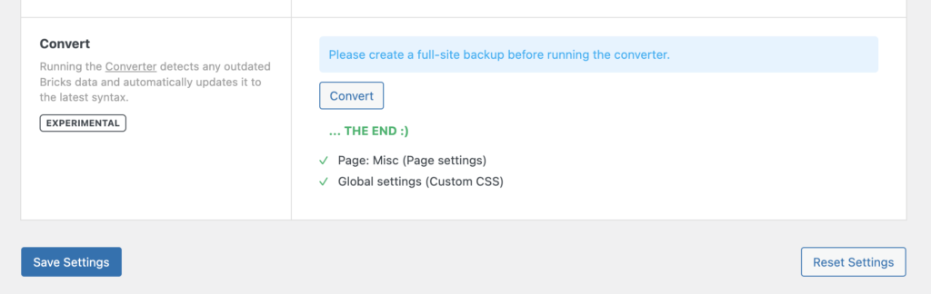 Depending on your server and the size of your Bricks data, this process can take a minute or two. Please do not close or refresh the page until you see the green “THE END” success message: