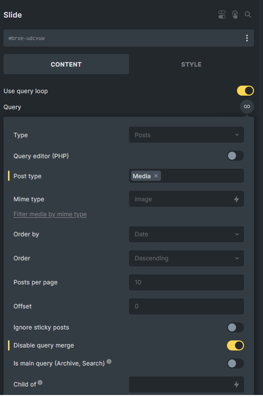 Section titled “Example: Use current taxonomy’s ACF gallery images IDs for a Media query loop (Nestable Slider)”If you want to build a dynamic Slider in term archive template, you can set the query loop on the Slide like below image, and use the code snippet below to retrieve the images IDs from the gallery field for each term, then assign them to the post__in parameter.