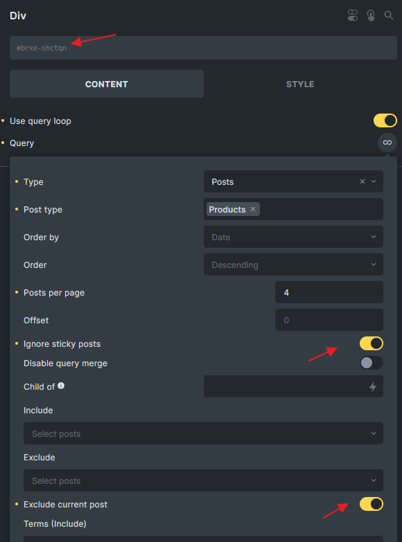 Section titled “Example: Get WooCommerce Related Products”Create a query loop with the following settings