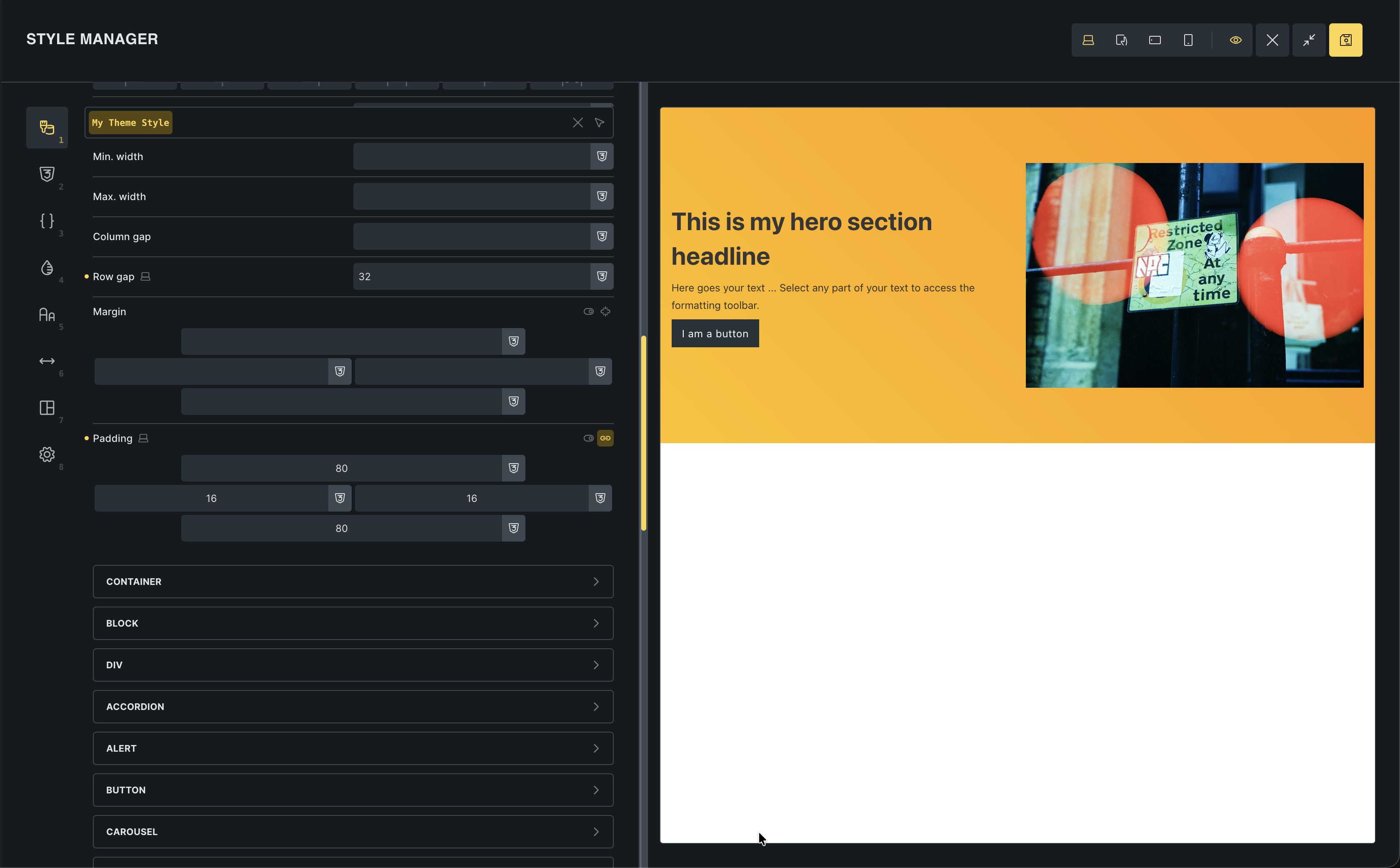 Watch the canvas: Your hero section immediately updates with the new padding! You didn’t touch the section itself; you just changed the global rule.