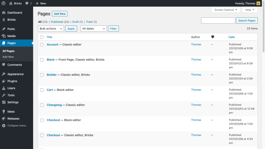 Section titled “Render content with Bricks or WordPress”You decide which pages you want to create with Gutenberg, the Classic Editor, or Bricks. The post status next to the page title tells you which content is used for rendering on the frontend: