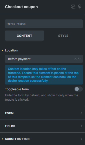 - By default, the Checkout Coupon element will appear where it’s placed in the layout. However, you can choose alternative positions, such as: Before Order Review Heading, After Order Review Heading, Before Payment
