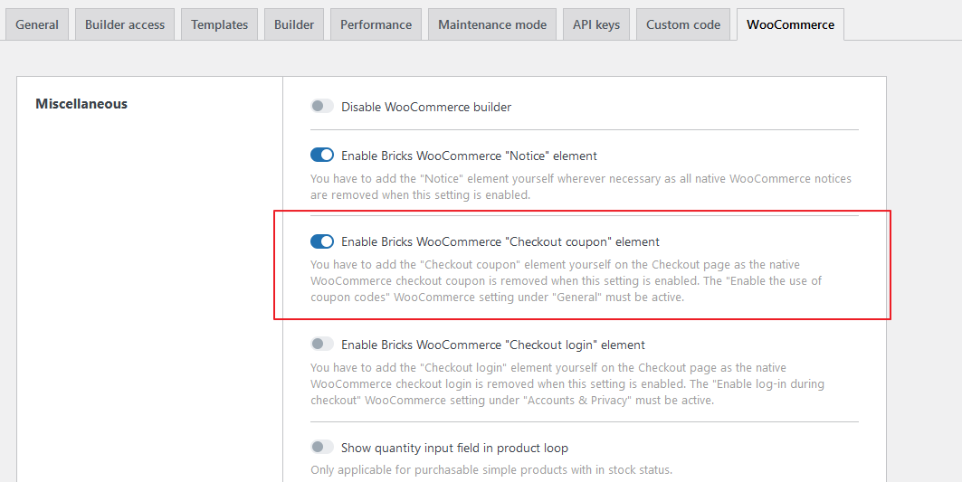 To use this element, first enable it under Bricks > Settings > WooCommerce by turning on Enable Bricks WooCommerce "Checkout coupon" element.