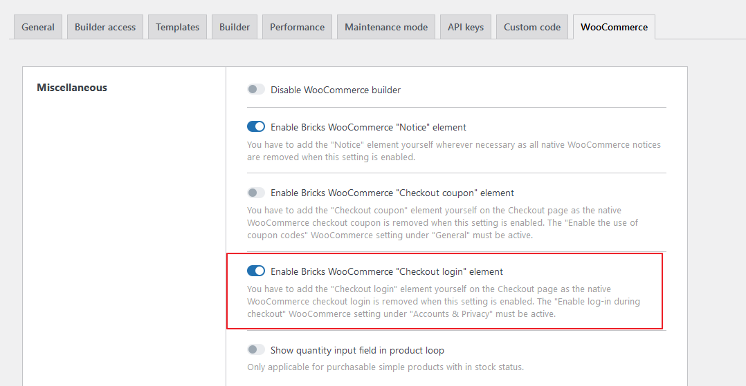 To use this element, activate it under Bricks > Settings > WooCommerce by toggling on Enable Bricks WooCommerce "Checkout login" element.