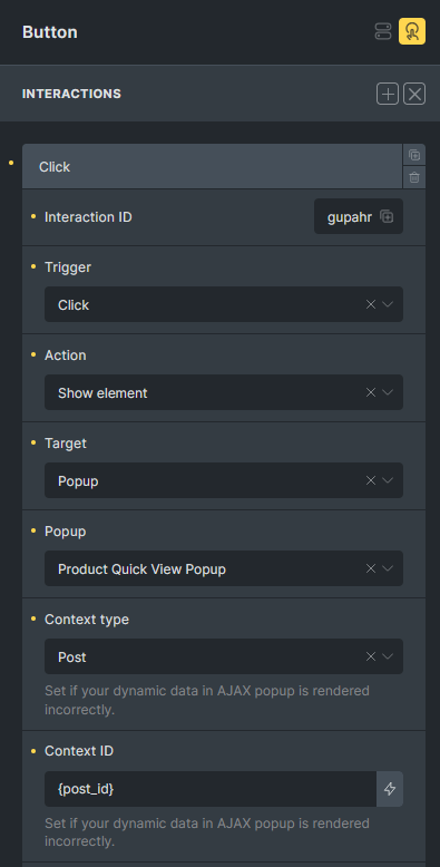 To ensure this button triggers the Quick View popup, configure the interaction as shown in the following screenshot: