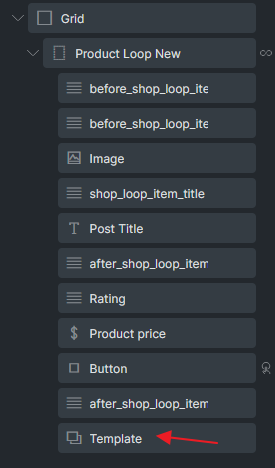Section titled “Step 4: Insert Popup template and Configure Interaction to Trigger Quick View Popup”Within the product query loop, insert a Template element and select the popup template you created in Step 1.