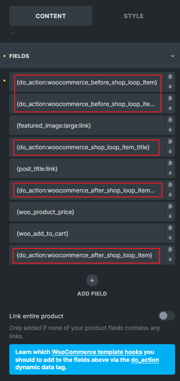 Section titled “WooCommerce Product Archive Template Hooks”For the WooCommerce Product Archive template, the following hooks are recommended to be used with the do_action dynamic tag: